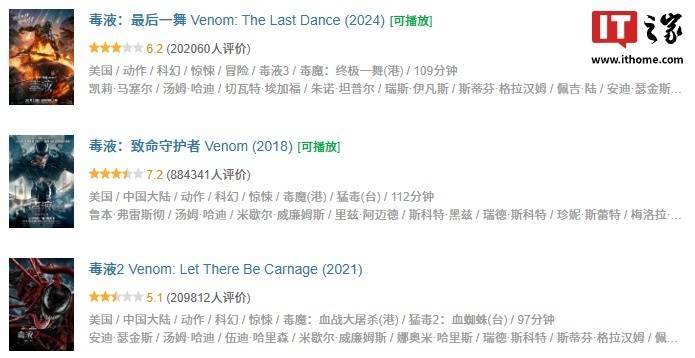 目前,索尼《蜘蛛侠》衍生宇宙仅《毒液》系列稳定产出三部曲,其余作品皆反响不佳,且《毒液》系列除了第一部评分在 7.2 分外,另外两部评分也均在 7 分以下。